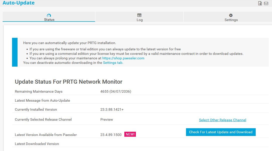 • PRTG does not start auto-update downloads if less than 500 MB disk space is available on the PRTG core server system. If this is the case, you can check this on the Log tab.