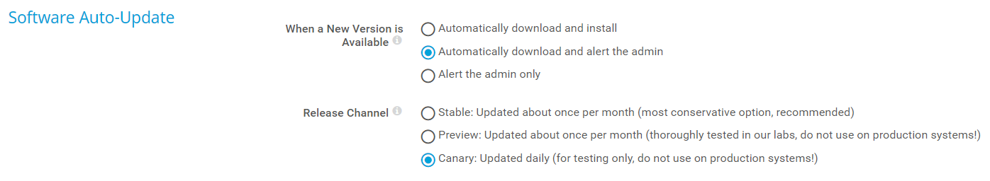 • Canary: Updated daily (testing only, should not be used on production systems): Deliver updates in the Canary release channel. These versions are updated every night.