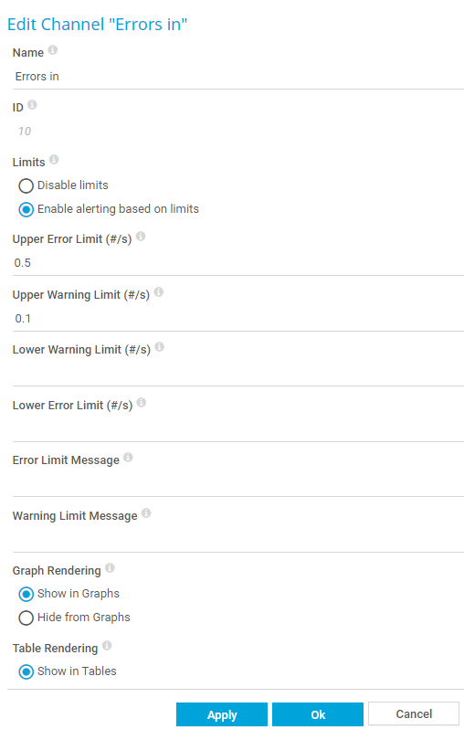 - Enable alerting based on limits: Define limits for the numeric values that are returned by the device. The sensor of which this channel is a part of shows the Warning state or the Down state when limits fall below the defined value or when limits are exceeded.