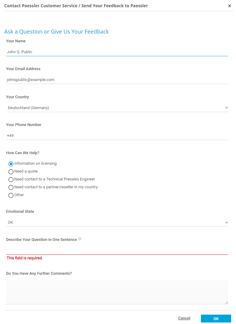 Click OK to send your question or feedback to our customer service. Click Cancel to close the customer service contact form without sending it.