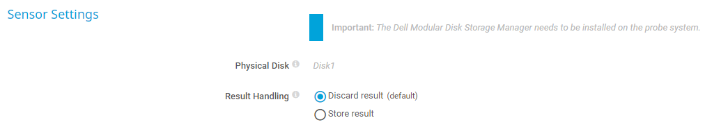 This sensor requires the installation of the Dell Modular Disk Storage Manager program. You must install it on the probe system (on every cluster node, if on a cluster probe). For details about setup, see section More below.