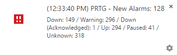 PRTG shows desktop notifications (by default, in the lower-right corner of your desktop) whenever there are new alarms after a page refresh in the PRTG web interface. The notification displays the number of new alarms and the current number of each sensor state.