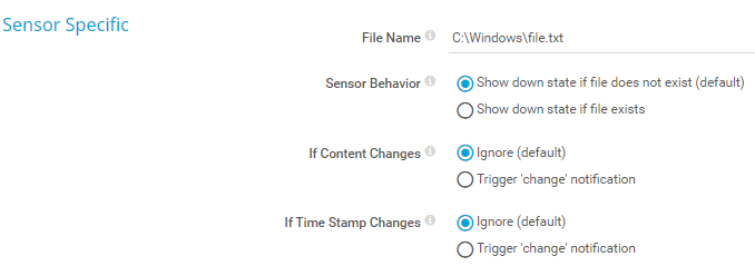 Enter the full path to the file that this sensor monitors. For example, enter C:\Windows\file.txt. to monitor a file on the probe system.