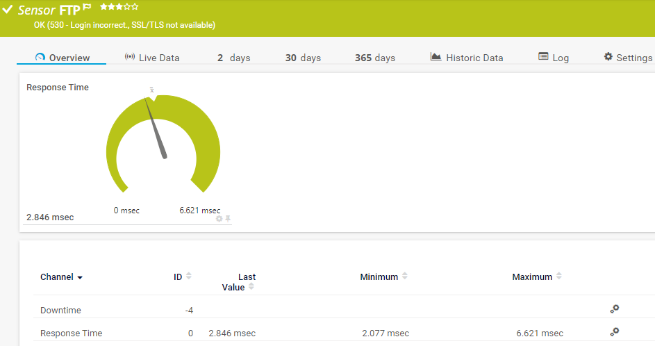 Use transport-level security if available: This sensor tries to connect via Secure Sockets Layer (SSL)/Transport Layer Security (TLS). It automatically determines whether to connect via the explicit mode or the implicit mode. If the server does not support SSL/TLS, the sensor tries to connect without connection security and shows the Up status if this works.