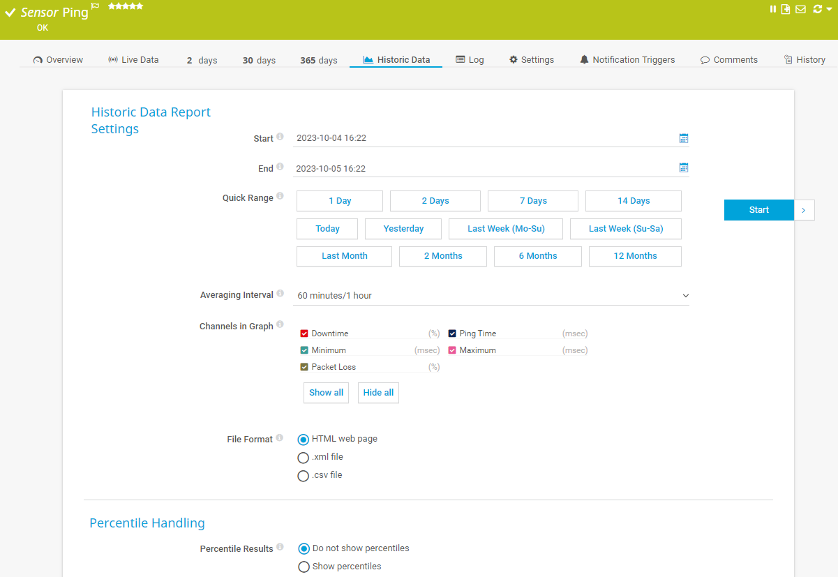 • Do not show percentiles: PRTG does not use a percentile formula to calculate your monitoring results. It only shows the standard values.