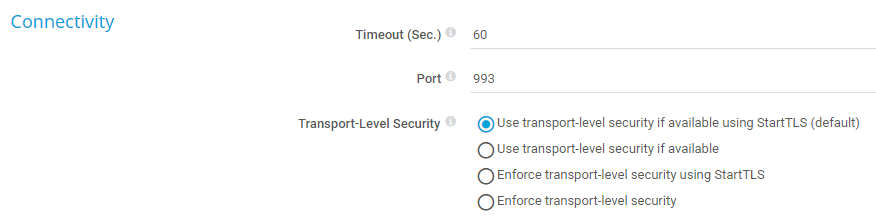 Use transport-level security if available using StartTLS (default): Try to connect to the server via a Secure Sockets Layer (SSL)/Transport Layer Security (TLS) secured connection and StartTLS. If the server does not support this, the sensor tries to connect without connection security.