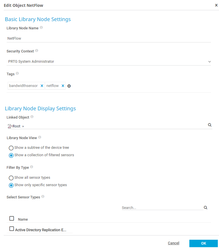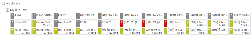 • When you select Show a collection of filtered sensors, PRTG only shows the sensors that are underneath the Linked Object in the device tree without probes, groups, and devices. You can additionally filter for certain sensor types, states, and tags. PRTG then only shows matching sensors. In the example screenshot, you can see the library node My Sub Tree where only bandwidth sensors are shown.