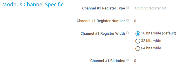 Holding register bit: Select Holding register bit to monitor a specific bit of the received value. Holding register numbers start with 4 and range from 40001 to 49999.
