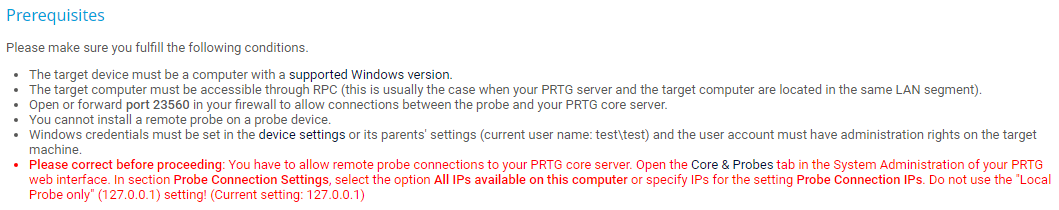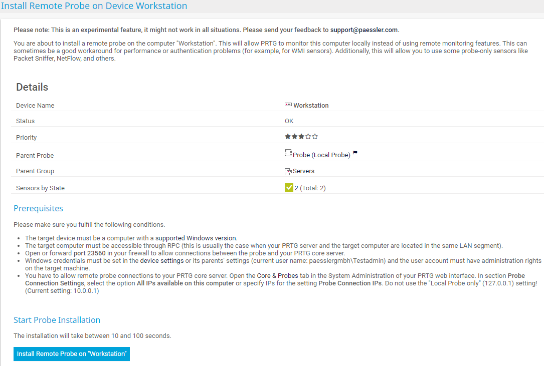 • Note that installing a remote probe directly from the device tree in the PRTG web interface is an experimental feature. This approach might not be possible in all situations.