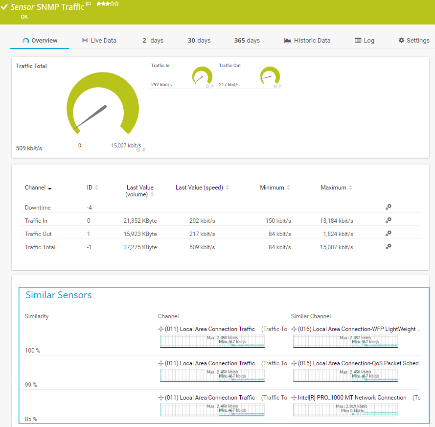 The similarity calculation is based on the values that are saved in the sensor history. If measured values change in the same way, the Similar Sensors Detection feature detects it and shows you the sensors for which it found similar data relations. PRTG shows all sensors that reach 85% to 100% similarity.