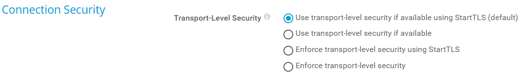• Use transport-level security if available using StartTLS (default): Try to connect to the server via a Secure Sockets Layer (SSL)/Transport Layer Security (TLS) secured connection and StartTLS. If the server does not support this, the sensor tries to connect without connection security.
