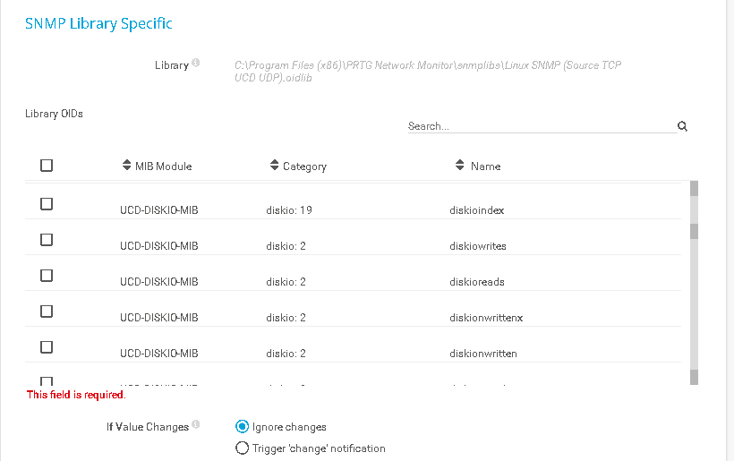 PRTG shows a list of .oidlib files that are available on the system. This list contains all library files in the \snmplibs subfolder of the PRTG program directory. It contains both the default PRTG library files and your own library files.