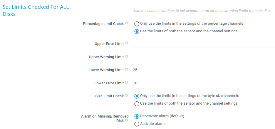 In this section, you can set limits that are valid for all channels and all drives. By entering limits, you can define when the sensor shows the Warning or the Down status, depending on the data provided by all drives that this sensor monitors. If you want to individually define limits for separate channels, use the limit settings in the channel settings.