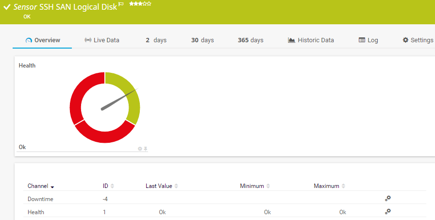 In the channel table on the Overview tab, this channel never shows any values. PRTG uses this channel in graphs and reports to show the amount of time in which the sensor was in the Down state