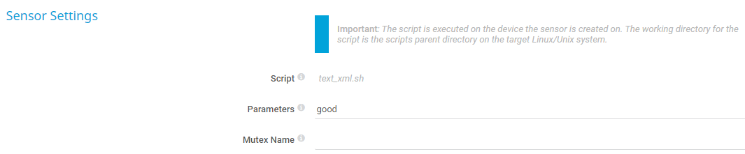 • For security reasons, this sensor requires that you store the script file in the /var/prtg/scriptsxml directory on the target system. Make sure that the script has executable rights.