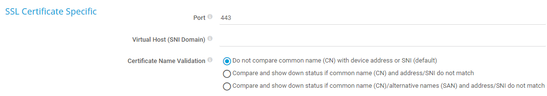 Compare and show down status if common name (CN) and address/SNI do not match: Check the common name to validate the certificate name. If you define an SNI above, the sensor compares the common name with the SNI. If you do not define an SNI, the sensor uses the host address of the parent device. If the common name and the checked address/SNI do not match, the sensor shows the Downstatus.