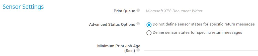 Optionally define the age of the print job in seconds. If you define a minimum print job age, the sensor does not regard jobs that are younger than this value. If you leave this field empty, the sensor does not check for the print job age. Enter an integer or leave the field empty.