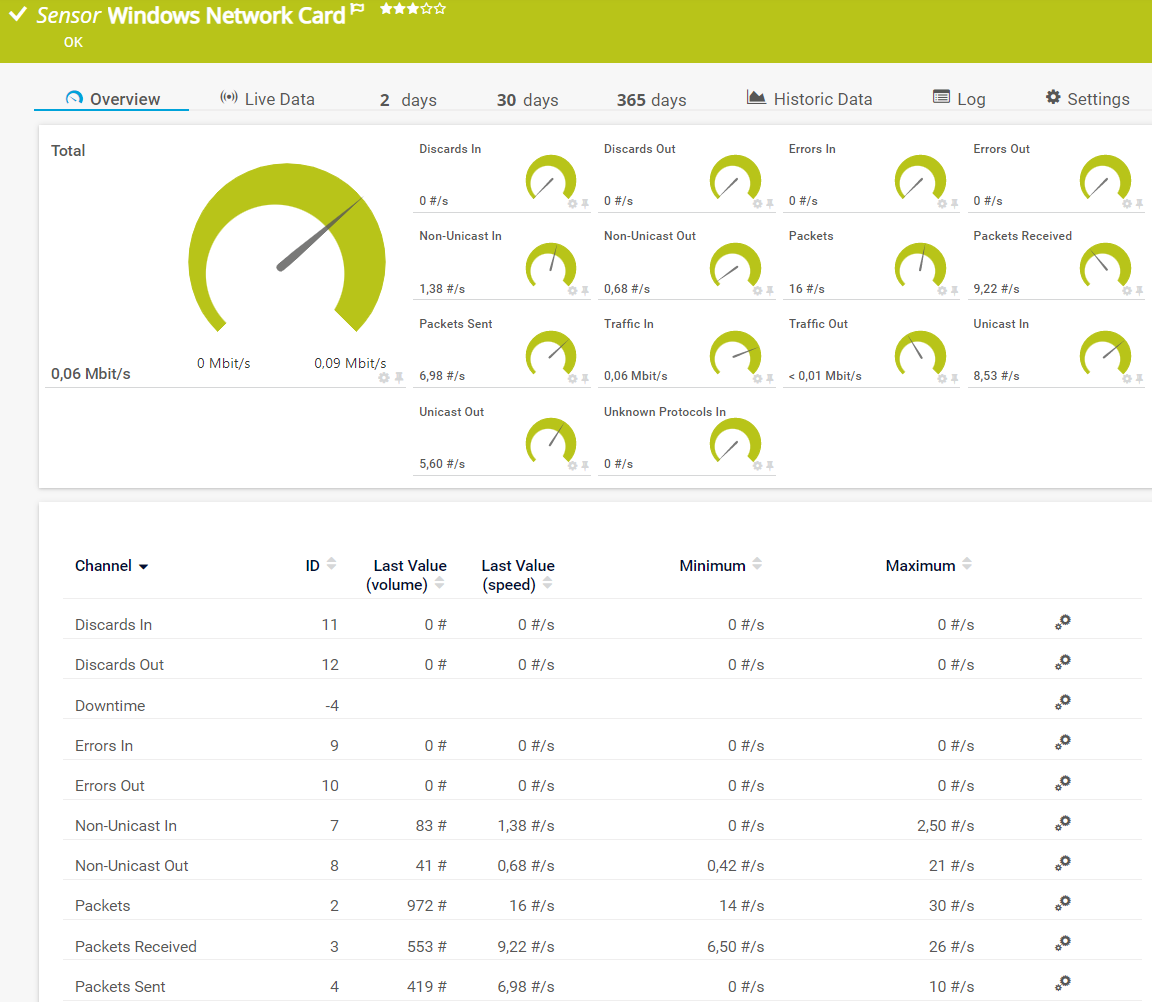 This sensor requires at least Windows Server 2008 R2 or Windows 7 to monitor 64-bit counters of the class Network Adapter (virtual network interfaces). On older target systems, the sensor can only monitor 32-bit counters of the class Network Interface (the physical interface) and shows fewer channels.